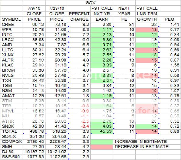 This is the weekly update of the SOX stocks in terms of earnings estimates, growth estimates and price changes sorted by price percent change. Like the Group stocks, there are many changes over this 2 week period for earnings estimates and growth estimates.