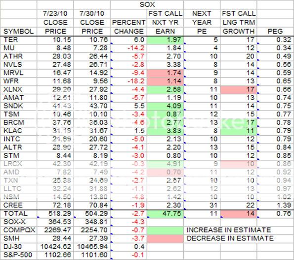 This is the same SOX data as the last post, but this time the data is sorted by PEG. The bottom line numbers for PE and PEG for the SOX are only slightly higher than for the Group.