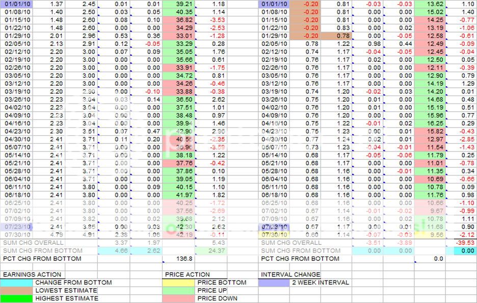 WFR had sort of the opposite week. They missed their earnings estimate and revenue estimate, and their outlook for 2nd half revenues did not meet consensus expectations. As a result, earnings estimates decreased somewhat, but the price really tanked. For the week, the price was down over 2 dollars a share which caused a new low for WFR since the table was started in 8/29/08, this is a period of nearly 2 years of a downward trend. Probably WFR is going to "bounce up and down" in a bottoming trend until several months down the road when it may start a true upward trend.