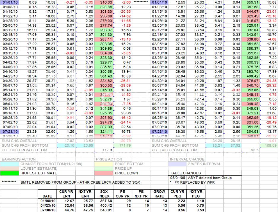 This is the weekly update for the Group and SOX tables in terms of earnings estimates and price changes. For these tables there have been big changes as well this past week.