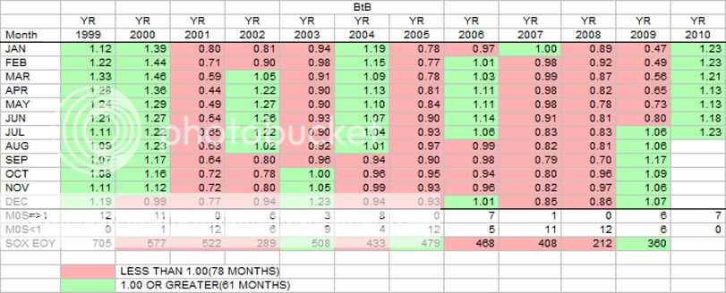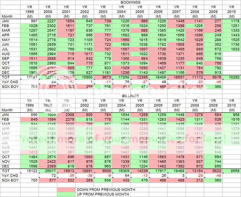 With the small exception of Oct 09, Bookings are now up 16 months in a row. Billings are up 15 months in a row. Most importantly, both of these upward trends are the longest in the table going all the way back to the start of the table in 1999. BtB is now above 1.0 for 13 months in a row. That is longer than any period except for 1999 and 2000.