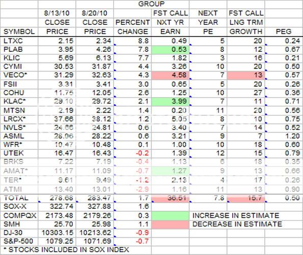 This the weekly look at the Group stocks in terms of earnings estimates, growth and price changes sorted by price change. Both earnings estimates and growth were reduced at the bottom line. Thirteen of the 18 stocks finished with positive gains for the week producing a bottom line gain of 1.7 percent.
