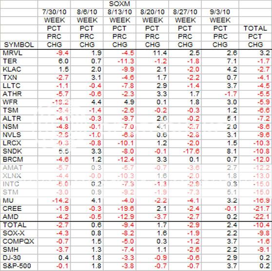 This is the longer 6 week look at the SOX stocks in terms of percent change. Here again, like the Group, the stocks are deeply in the red over this period.