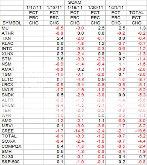 Again, just like the Group, all stocks are in the red for the week with the exception of MU with a small 1.3 percent gain. The SOXM performed even worse than the SOX, down 5.2 percent compared to 4.4 percent. CREE was the big down hammer this week losing 19.6 percent due to their not well accepted quarterly earnings report. SMH managed to do relatively well this week, losing only 1.9 percent.