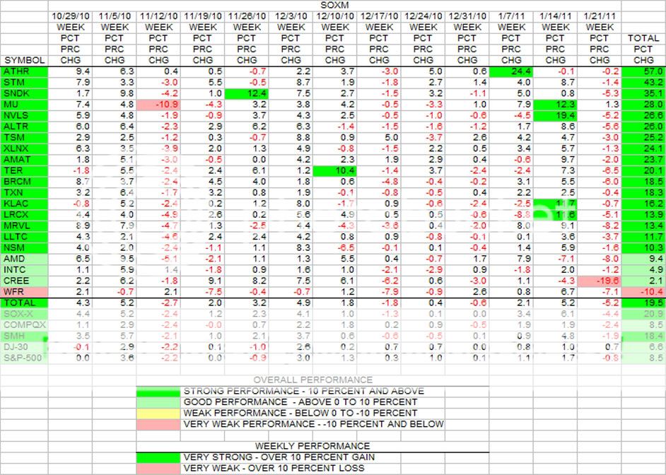 This is the update to the 13 week rolling quarter for the SOXM stocks in terms of percent change.
