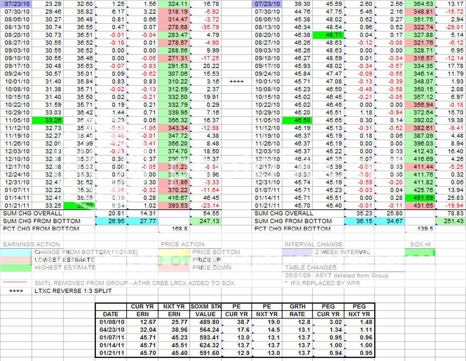After a blowout week last week, a lot of back tracking in this 4 day trading week. While the Group and SOX prices in the large table did not drop all the way back to last weeks number, the SOXM wiped out all of last weeks gains to finish below the week of 1/7 as shown in the smaller table on the bottom. Earnings estimates for the Group were up sharply, due primarily to ASML, while the earnings estimates for the SOXM dropped a small amount.
