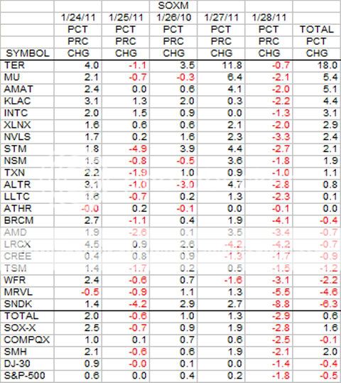 Again, the same story as for the Group, the 1st 4 days of week were rolling along quite well, but Friday all the stocks were down leaving small gains or losses for the week overall at the bottom line. TER stands out even more clearly in this table with an 18 percent gain while MU is in 2nd place with a 5.4 percent gain. SNDK hit a rough patch on Friday losing 8.8 percent after reporting earnings after the close on Thursday.