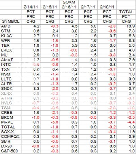 AMD easily leads the SOXM stocks with a 10.9 percent gain. Six of the 21 stocks are in the red for the week. BRCM has been really struggling lately and was the only stock in the red for all 5 days and finished in next to last place with a 3.5 percent loss for the week. MRVL took a big hit on Tuesday to finish in last place with a 4.4 percent loss.