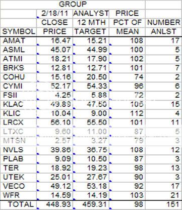 The table shows the target prices for the next 12 months for the Group stocks. With the exception of FSII, COHU's closing price on Friday has the lowest percentage value in the table with respect to its 12 month target. Many of the stocks closed above their 12 month values on Friday. Also, note that COHU has only 2 analysts following the stock. This means the consensus may be not as reliable as those larger cap stocks with larger analyst followings.