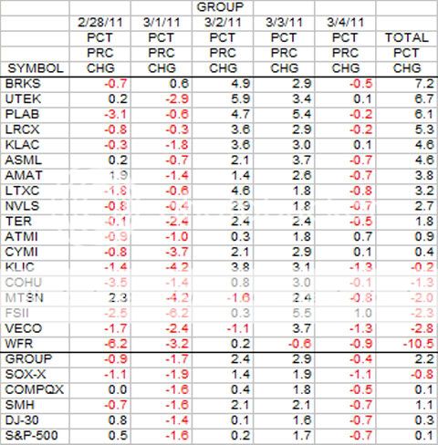 Monday, Tuesday, and Friday were mostly down, and Wednesday/Thursday were quite strong leaving the bottom line with small gains except for the SOX which was down 0.8 percent. Even with WFR fouling up the works losing 10.5 percent, the Group stocks were in top spot with a 2.2 percent gain.