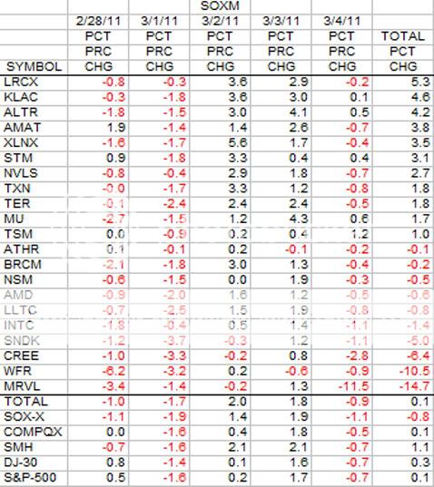 This week the SOXM was about as evenly split as possible. Eleven of the stocks were up and 10 were down leaving the bottom line with a 0.1 percent gain. All indices were up with the exception of the SOX down 0.8 percent. Tuesday was the worst day of the week with all stocks and indices down. Friday was not a good day either for the bottom line numbers.