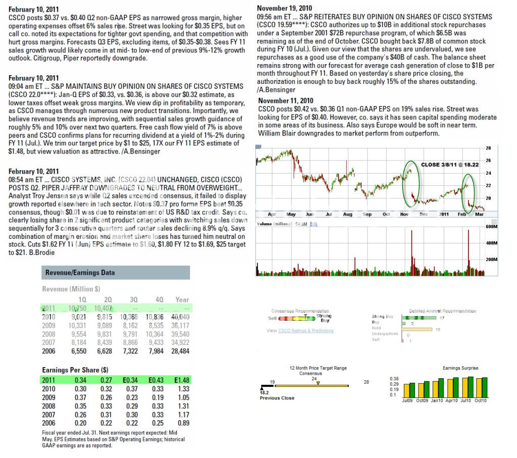 Jacob, Ubtil you brought up the chart of CSCO, I had not looked at it for a long, long time. I was really intrigued by the chart action at quarterly points for earnings reporting. In so many words, CSCO was "hammered" at those points. You would have thought the "sky had fallen" and CSCO was a "broken" company. When I looked at some of the details however, I was surprised again. The ccompany looks just fine with record revenues in the first 2 quarters of the FY and earnings pretty much in line with expectations that were set when the stock was selling at 28. Today it closed at 18.22.