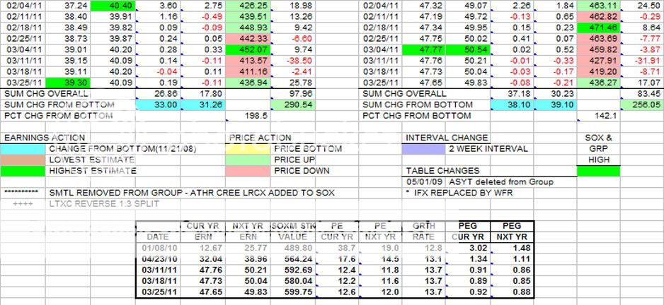 This is the weekly update of the Group and SOXM(SOX) tables in terms of earnings estimates and price changes.