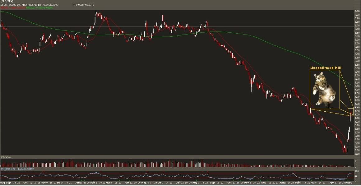 Here is the daily GLD/SLV ratio, which is still trending down. I post this because waiting for the dead cat bounce is something I'd prefer to do in the future before a trade instead of after.