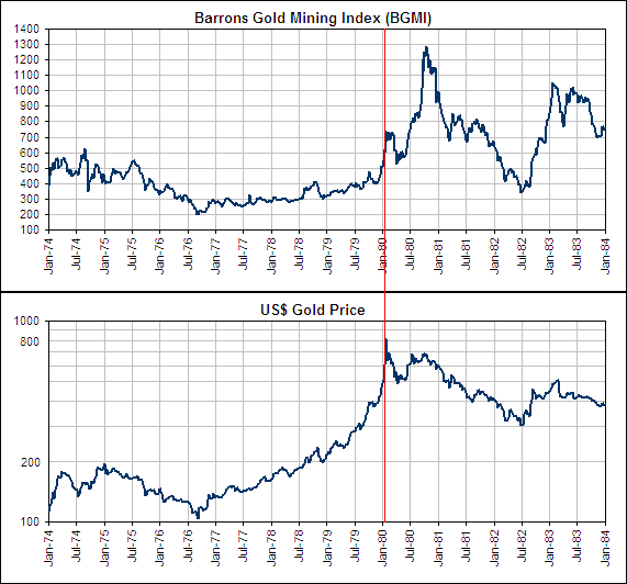 When gold bullion peaked at $800-$850 in January of 1980, the BGMI was no higher than it was in 1974. This means that the BGMI did no better than 'tread water' over a multi-year period during which the gold price quadrupled.