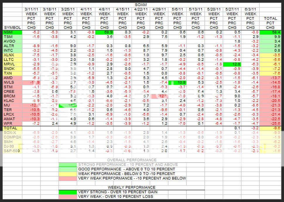 This is the update of the 13 week rolling quarter for the SOXM stocks in terms of percent change.