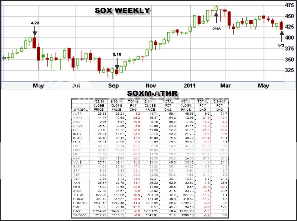 To: Donald Wennerstrom who wrote (52301 ) 6/4/2011 8:59:28 PM From: Donald Wennerstrom 2 Recommendations Read Replies (1) | Respond to of 95657 Looking at the weekly chart of the SOX some recent interim peaks and bottoms can be found. In this case the chart shows a peak at 4/23/10, about 13+ months ago, then a pullback to 9/10/10, then the strong rise to 2/18/11, and finally the pullback presently in process until Friday's close. The table below the chart shows how the individual stocks in the SOXM(minus ATHR) performed during each of these periods. The first downtrend from April to September shows most of the individual stocks losing well into the double digits. Only ALTR, BRCM, LLTC and XLNX avoided this fate. At the bottom line, the SOXM lost 19.8 percent and the SOX lost 20.9 percent. During the uptrend from September to February, only AMD failed to score a double digit gain while 3 of the stocks, CREE, LRCX, and SNDK gained over 50 percent. Bottom line the SOXM was up 42 percent and the SOX was up 48.9 percent. From February to the present, the market has been trending down again, particularly the SOXM and SOX, both down 11.2 percent. Only 3 stocks, ALTR, NSM and TSM are above water, with NSM in an ongoing buyout deal which provides the 57.7 percent gain. Most of the other stocks have double digit losses with some of the losses quite large. AMAT, CREE, MU, TER, and WFR are down over 20 percent. The last column shows the overall results from April to last Friday's close. Some big winners show up as well as big losers. A lot of averaging going on to have some rather small numbers at the bottom line. Ignoring the special NSM situation, ALTR is the big champion on the upside with a 71.7 percent gain. CREE is the big loser on the downside with a 48 percent loss. Overall, the SOXM is up 1.1 percent and the SOX is up 4.5 percent. This type of stock behavior shown in the chart and table happens over and over again as time progresses. The results of this evaluation, over a little more than a year, show the importance of picking the right stock and being on the right side of the market when it is going up and down. But of course, we all knew that. Now as individuals we need to continue the effort to pick the right stock(s) and be on the right side of the market. I would invite anyone looking at this thread to offer their ideas on market direction or stock picks for those stocks we follow. If we do this in a positive manner, respecting others opinions, maybe we can all do better in our investing returns. Right now we are in a flat to downtrending market over the past 15 weeks. How can we find the next bottom point as close as possible in order to benefit the most from the next up cycle? Also, what stock(s) will give the best performance on the upside?