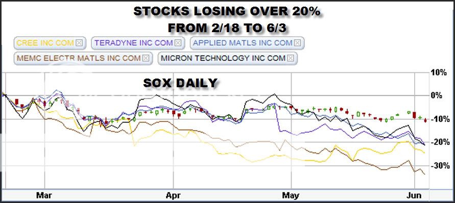 AMAT and MU tracked the SOX quite well until the 1st part of May. TER had a big drop the last of April and then flattened out to finish with AMAT and MU. CREE and WFR began falling off the 1st of March. CREE was trying to recover somewhat through April and May without much luck. And then there was WFR - what can I say????:), straight downhill from the 1st of April to the present.