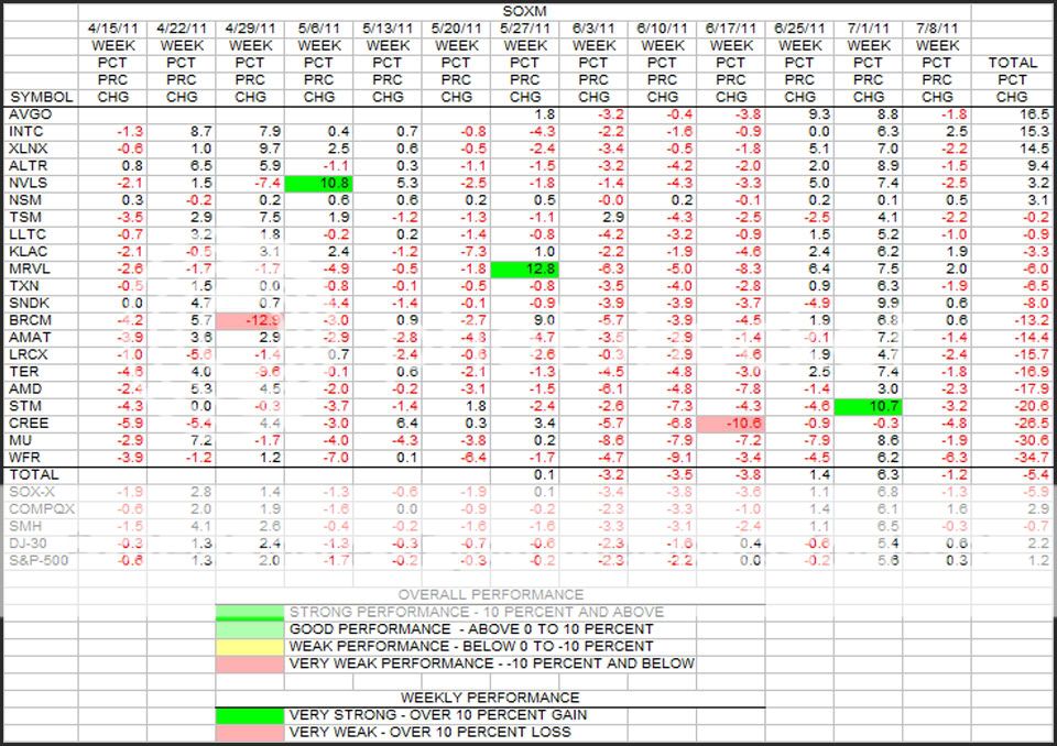 This is the weekly update of the 13 week rolling quarter for the SOXM stocks in terms of percent change.
