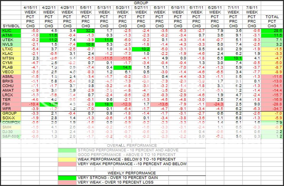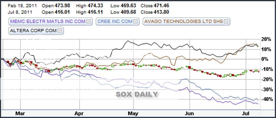 From this posted table, a graphical look at the top 2 stocks, ALTR and AVGO, and the bottom 2 stocks, CREE and WFR, are shown in the chart along with the SOX from 2/18/11 to Friday's close.