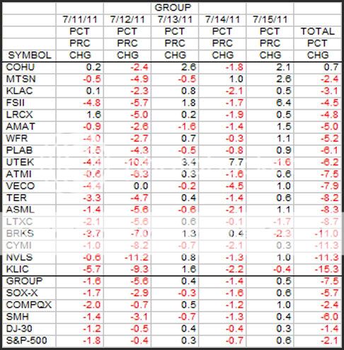 This is the weekly look at the Group stocks in terms of percent change. Let's hear it for COHU, the only stock in the Group to finish with a gain for the week.