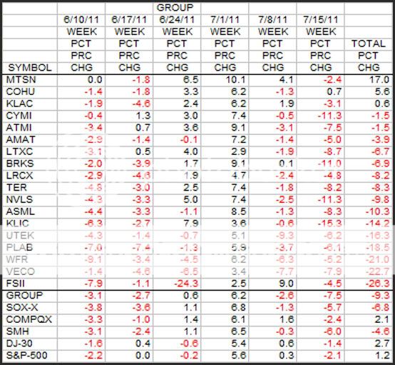 Three stocks are up for the period, and 3 of the stocks lost over 20 percent. The semis have been taking a beating over the 6 weeks, while the major averages have finished in the black.