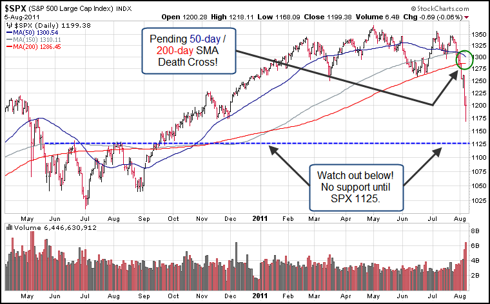 Against such a backdrop, gold could very well be poised to enter its parabolic stage as early as Monday. As gold moves higher, expect to find it up $100 in a single day. Such an unprecedented move becomes less of a percentage gain with every incremental move of $100 higher from this point onward. Indeed, gold could quickly gallop into the $2,000s by fall with any forthcoming announcement of QE3. Should equities gap below Friday's lows on Monday morning, watch out below! There is no support on the S&P 500 until 1,125. The die certainly has been cast for gold bulls and equity bears Monday morning.