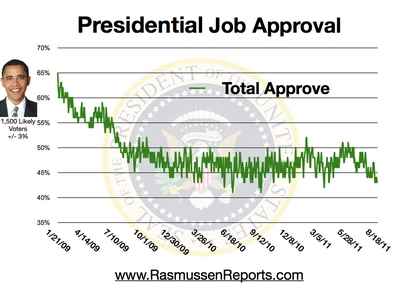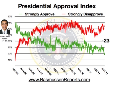 To: Kenneth E. Phillipps who wrote (110871 ) 8/18/2011 11:04:16 AM From: TideGlider 2 Recommendations Read Replies (1) | Respond to of 224759 Daily Presidential Tracking Poll Thursday, August 18, 2011 The Rasmussen Reports daily Presidential Tracking Poll for Thursday shows that 19% of the nation's voters Strongly Approve of the way that Barack Obama is performing his role as president. Forty-two percent (42%) Strongly Disapprove, giving Obama a Presidential Approval Index rating of -23 ( see trends ). Just 15% now believe the country is generally heading in the right direction . That’s down 10 points from a month ago and 20 points from a year ago. Only 20% support continuing the U.S. military action in Libya . Most (52%) are opposed. An even smaller number (15%) expect the situation in Afghanistan to improve over the next six months. The Presidential Approval Index is calculated by subtracting the number who Strongly Disapprove from the number who Strongly Approve. It is updated daily at 9:30 a.m. Eastern (sign up for free daily e-mail update ). Updates are also available on Twitter and Facebook . Overall, 43% of voters say they at least somewhat approve of the president's performance. Fifty-four percent (54%) at least somewhat disapprove. Larry Kudlow weighs in on Rick Perry’s “red-hot rhetorical attack on Fed-head Ben Bernanke” and Michael Barone claims the GOP has momentum but lacks direction. (More Below) The Wall Street Journal has called Scott “America’s leading insurgent pollster” and the Washington Post says he is a “driving force in American politics.” If you’d like Scott to speak to your organization, meeting, or conference, please contact Premiere Speakers. You can also follow Scott on Facebook. In a book released last year, Scott observed that "the gap between Americans who want to govern themselves and politicians who want to rule over them may be as big today as the gap between the colonies and England during the 18th century." He added that "the American people don't want to be governed from the left, the right, or the center. They want to govern themselves." In Search of Self-Governance is available at Amazon.com . MAD AS HELL: How the Tea Party Movement is Fundamentally Remaking Our Two-Party System, by Scott Rasmussen and Doug Schoen, can be ordered at Amazon.com , Barnes and Noble , Borders and other outlets . It's also available in bookstores everywhere. It is important to remember that the Rasmussen Reports job approval ratings are based upon a sample of likely voters. Some other firms base their approval ratings on samples of all adults. Obama's numbers are always several points higher in a poll of adults rather than likely voters. That's because some of the president's most enthusiastic supporters, such as young adults, are less likely to turn out to vote. It is also important to check the details of question wording when comparing approval ratings from different firms. (More Below) Rasmussen Reports has been a pioneer in the use of automated telephone polling techniques, but many other firms still utilize their own operator-assisted technology ( see methodology ). Pollsters for Presidents Jimmy Carter and Bill Clinton have cited our " unchallenged record for both integrity and accuracy ." The Pew Center noted that Rasmussen Reports beat traditional media in covering Scott Brown's upset win in Massachusetts earlier this year: "It was polling-not journalistic reporting-that caught the wave in the race to succeed Massachusetts Senator Edward M. Kennedy." Rasmussen Reports was also the first to show Joe Sestak catching Arlen Specter in the Pennsylvania Democratic Primary race last year. Once again in 2010, Rasmussen Reports polling provided an accurate preview of Election Night outcomes. See how we did . Larry Sabato, director of the Center for Politics at the University of Virginia, noted, “This was one tough election to poll and forecast. Rasmussen Reports caught the major trends of the election year nationally and in most states.” In December 2009, a full 11 months before Election Day. A Democratic strategist concluded that if the Rasmussen Reports Generic Congressional Ballot data was accurate, Republicans would gain 62 seats in the House during the 2010 elections. Other polls at the time suggested the Democrats would retain a comfortable majority. The Republicans gained 63 seats in the 2010 elections. Rasmussen’s final 2010 projections were published in the Wall Street Journal . Scott Rasmussen noted that “it would be wise for all Republicans to remember that their team didn't win, the other team lost. Heading into 2012, voters will remain ready to vote against the party in power unless they are given a reason not to do so.” In the 2009 New Jersey Governor's race, automated polls tended to be more accurate than operator-assisted polling techniques. On reviewing the state polling results from 2009, Mickey Kaus offered this assessment, "If you have a choice between Rasmussen and, say, the prestigious N.Y. Times, go with Rasmussen!" In 2008, Obama won 53%-46% and our final poll showed Obama winning 52% to 46%. While we were pleased with the final result, Rasmussen Reports was especially pleased with the stability of our results. On every single day for the last six weeks of the campaign, our daily tracking showed Obama with a stable and solid lead attracting more than 50% of the vote. We also have provided a summary of our 2008 state-by-state presidential results for your review. In 2004 George W. Bush received 50.7% of the vote while John Kerry earned 48.3%. Rasmussen Reports polling projected that Bush would win 50.2% to 48.5%. We were the only firm to project both candidates' totals within half a percentage point by (see our 2004 results ). See also our 2008 state results for Senate and governor. See 2006 results for Senate and Governor. Daily tracking results are collected via telephone surveys of 500 likely voters per night and re