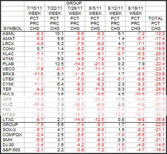 Four of the 6 weeks were very strong to the downside leaving the overall period deep into the red. KLIC, FSII, MTSN, and LTXC all are down over 30 percent. ASML in top spot is down 12.2 percent.