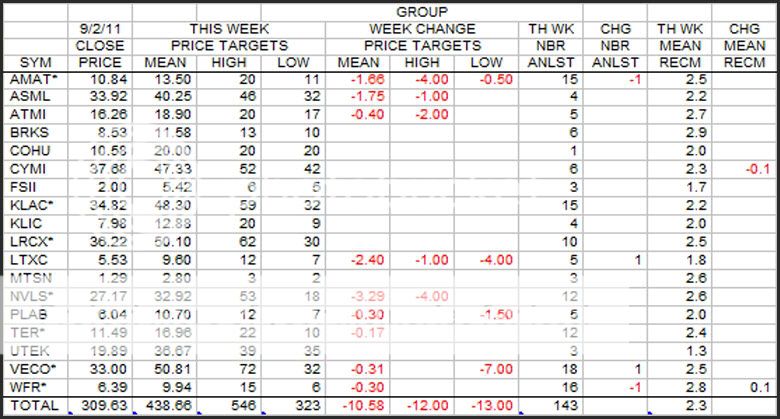 Price targets this week are all down. This is in keeping with the general trend for several months. The mean for NVLS was reduced the most, down 3.29. Both NVLS and AMAT had their high targets reduced by 4.00. VECO had its low target reduced by 7.00.