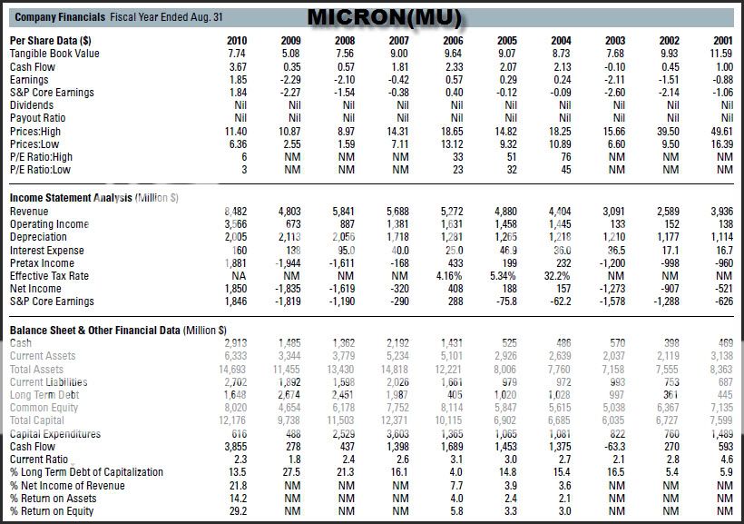 Luckily, we do not have to work hard at all to look at a summary of 10 year data for Micron. S&P has already done it for us.