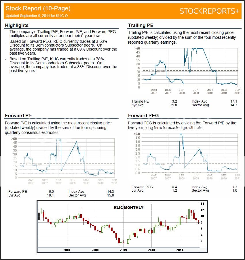 Looking at the KLIC performance over the past year as leader of the Group stock performance, I reviewed the Reuters research report for more information. The report is very thorough, and one of the pages from the report reviews the PE and PEG performance over the past 5 years. That page is shown below along with a 5 year monthly chart of KLIC for comparison of price performance compared to the PE and PEG data.