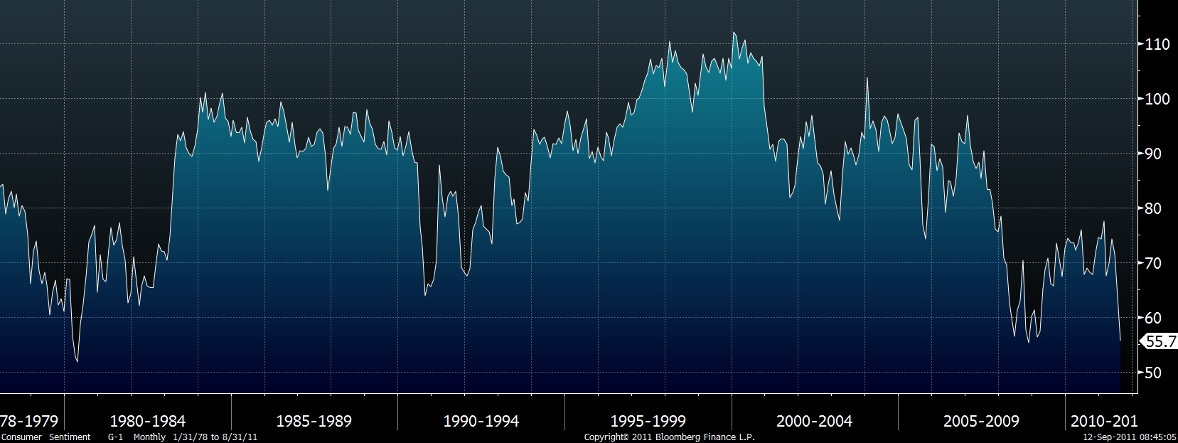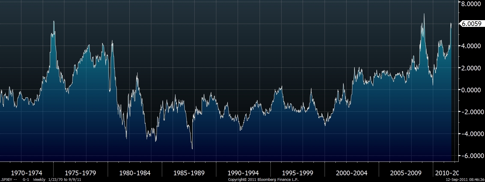 To: pcyhuang who wrote (53698 ) 9/14/2011 5:00:38 AM From: pcyhuang 1 Recommendation Read Replies (2) | Respond to of 95530 Has a Greek Default Already Been Priced in the Market? The press of popular opinion works everyone into a frenzy about Greece, the eurozone, a repeat of 2008, Lehman's Part II etc, etc. We all know what happened in 2008 when the world financial system completely froze. However, the fact that many investors are now prepared for something diabolical to happen probably ensures that 2008 will not repeat itself, at least not in the way that the doomsayers are expecting. Let's step back in time and look at how things existed before Lehman Brothers defaulted. This time 3 years ago, 47% of stocks on the NYSE were trading above their 50 day moving average on the NYSE 50 Day Moving Average Ratio. Now there are only 14%. So, markets were in a "neutral" condition in 2008 and now they’ve moved to ‘extreme’ by historical standards. (Click to enlarge) (Click to enlarge) There are other differences. For instance, this time around we’ve been through a "mini-crash" and perhaps entered a bottoming process. In 2008, however, things were slowly drifting down with no dramatic blow-off to indicate the possibility of an exhaustion of selling pressure. (Click to enlarge) (Click to enlarge) Also, some of the selling pressure observed over the last month or so has been more intense than that observed in the crash of 2008. How about U.S. Treasuries? Well we’ve already seen a rather dramatic move in the U.S. Treasury market, significantly more than what we saw in September/October 2008. It seems like the market is anticipating a default before there is a default, which is very different to what happened in 2008 when default by Lehmans and its consequences were not fully understood or anticipated. (Click to enlarge) But fast forward to now and it would seem that the consequences of a default by Greece are fully understood and anticipated by the market. (Click to enlarge) When you consider that yields on Treasuries of varying maturities are already below where they were in 2008 and that the yield of the U.S. 10yr is now almost half that of the rate of inflation, it is hard to believe there could be material upside treasuries from current levels. We must also consider the yield differential between the S&P 500 and U.S. Treasuries. It got to 7% in the height of the crisis in 2008, now it sits at about 6%. So 2008 has already repeated itself to a large extent. Earnings Yield Differential Between S&P 500 and the U.S. 10 yr (Click to enlarge) From an ultra-long term perspective, consumer sentiment is significantly more bearish now than what it was prior to the default by Lehmans. In fact consumer sentiment is just about as bad as it was in late 2008, post-Lehmans. Michigan Consumer Sentiment Index (Click to enlarge) The bottom line is this: the consequences of a default by Lehmans were not anticipated (priced into the market) prior to it happening in September 2008. However, the consequences of Greece defaulting appear to be anticipated by the market, before Greece has actually defaulted. Let’s remember: it is the anticipation of an event that is critical rather than the event itself . Paradoxically, perhaps the big risk now is of Greece not defaulting, because it is not priced into the market! I will end with Templeton's famous quote: "bull markets are born in pessimism, grow in skepticism, mature in optimism, and die in euphoria" Source: Seekingalpha.com