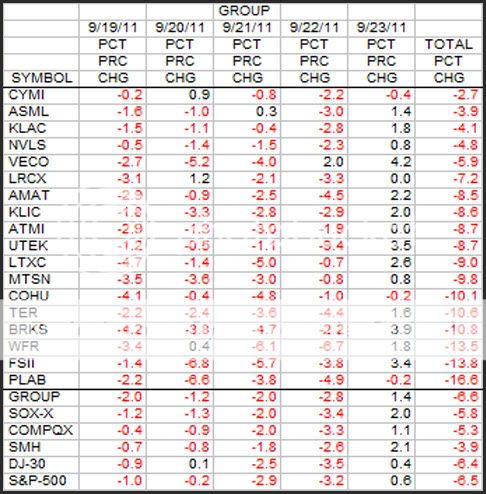A very down week overall with only Friday showing some life to the upside. All Group stocks and indices were deep in the red for the week. Six of the stocks were down over 10 percent.