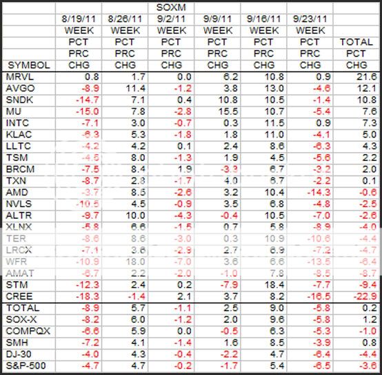 Here we have 3 of the stocks, MRVL, AVGO, and SNDK up over 10 percent. Ten of the 20 stocks are up for the period. CREE really bit the dust with a loss of 22.9 percent.