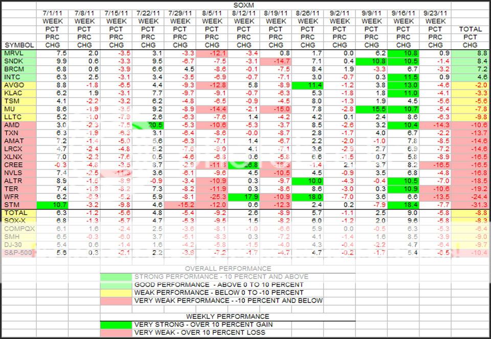 This is the update of the 13 week rolling quarter for the SOXM stocks in terms of percent change.