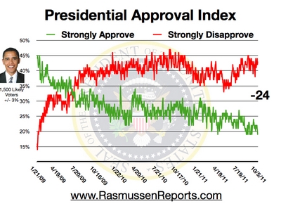 To: Kenneth E. Phillipps who wrote (114680 ) 10/5/2011 11:15:13 AM From: TideGlider 4 Recommendations Respond to of 224756 Daily Presidential Tracking Poll Wednesday, October 05, 2011 The Rasmussen Reports daily Presidential Tracking Poll for Wednesday shows that 19% of the nation's voters Strongly Approve of the way that Barack Obama is performing his role as president. Forty-three percent (43%) Strongly Disapprove, giving Obama a Presidential Approval Index rating of -24 ( see trends ). Only once, on August 31 of this year, has this president had a lower Approval Index rating. President Obama trails a Generic Republican by six points in a very early look at Election 2012. The Rasmussen Employment Index , which measures workers’ perceptions of the labor market each month, gained back a little lost ground in September after falling to a 2011 low in August. Still, just 18% of workers report their employers are hiring while 22% still report lay-offs. It has now been three full years since the number hiring topped the number for lay-offs. Just 29% of American Adults believe the United States has the best economy in the world. That’s down from 35% a year ago . Only 19% have a favorable opinion of Treasury Secretary Timothy Geithner. Rasmussen Reports has launched a new subscription service providing have access to more than 20 exclusive stories each week. It’s just $3.95 a month or $34.95 a year . Check it out with a three-day free trial subscription . The Presidential Approval Index is calculated by subtracting the number who Strongly Disapprove from the number who Strongly Approve. It is updated daily at 9:30 a.m. Eastern (sign up for free daily e-mail update ). Updates are also available on Twitter and Facebook . Overall, 42% of voters say they at least somewhat approve of the president's job performance. Fifty-six percent (56%) at least somewhat disapprove. Only 36% believe that human activity is primarily to blame for Global Warming . Forty-four percent (44%) think long-term planetary trends are at work. Most think President Obama believes human activity is the cause. (More Below) The Wall Street Journal has called Scott Rasmussen “America’s leading insurgent pollster” and the Washington Post says he is a “driving force in American politics.” If you’d like Scott to speak to your organization, meeting, or conference, please contact Premiere Speakers. You can also follow Scott on Facebook. In a book released last year, Scott observed that "the gap between Americans who want to govern themselves and politicians who want to rule over them may be as big today as the gap between the colonies and England during the 18th century." He added that "the American people don't want to be governed from the left, the right, or the center. They want to govern themselves." In Search of Self-Governance is available at Amazon.com . MAD AS HELL: How the Tea Party Movement is Fundamentally Remaking Our Two-Party System, by Scott Rasmussen and Doug Schoen, can be ordered at Amazon.com , Barnes and Noble , and other outlets . It's also available in bookstores everywhere. It is important to remember that the Rasmussen Reports job approval ratings are based upon a sample of likely voters. Some other firms base their approval ratings on samples of all adults. Obama's numbers are always several points higher in a poll of adults rather than likely voters. That's because some of the president's most enthusiastic supporters, such as young adults, are less likely to turn out to vote. It is also important to check the details of question wording when comparing approval ratings from different firms. (More Below) Rasmussen Reports has been a pioneer in the use of automated telephone polling techniques, but many other firms still utilize their own operator-assisted technology ( see methodology ). Pollsters for Presidents Jimmy Carter and Bill Clinton have cited our " unchallenged record for both integrity and accuracy ." The Pew Center noted that Rasmussen Reports beat traditional media in covering Scott Brown's upset win in Massachusetts earlier this year: "It was polling-not journalistic reporting-that caught the wave in the race to succeed Massachusetts Senator Edward M. Kennedy." Rasmussen Reports was also the first to show Joe Sestak catching Arlen Specter in the Pennsylvania Democratic Primary race last year. Once again in 2010, Rasmussen Reports polling provided an accurate preview of Election Night outcomes. See how we did . Larry Sabato, director of the Center for Politics at the University of Virginia, noted, “This was one tough election to poll and forecast. Rasmussen Reports caught the major trends of the election year nationally and in most states.” In December 2009, a full 11 months before Election Day. A Democratic strategist concluded that if the Rasmussen Reports Generic Congressional Ballot data was accurate, Republicans would gain 62 seats in the House during the 2010 elections. Other polls at the time suggested the Democrats would retain a comfortable majority. The Republicans gained 63 seats in the 2010 elections. Rasmussen’s final 2010 projections were published in the Wall Street Journal . Scott Rasmussen noted that “it would be wise for all Republicans to remember that their team didn't win, the other team lost. Heading into 2012, voters will remain ready to vote against the party in power unless they are given a reason not to do so.” In the 2009 New Jersey Governor's race, automated polls tended to be more accurate than operator-assisted polling techniques. On reviewing the state polling results from 2009, Mickey Kaus offered this assessment, "If you have a choice between Rasmussen and, say, the prestigious N.Y. Times, go with Rasmussen!" In 2008, Obama won 53%-46% and our final poll showed Obama winning 52% to 46%. While we were pleased with the final result, Rasmussen Reports was especially pleased with the stability of our results. On every single day for the last si
