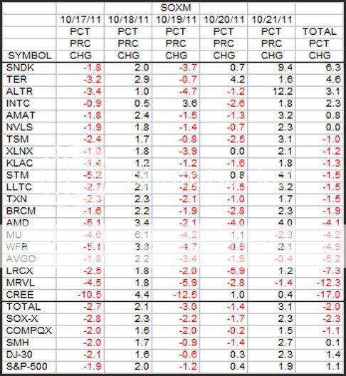 Compared to last week when the SOXM was up by 6.8 percent, this week it is down by 2.0 percent. The SOX fared a little worse, down 2.3 percent.