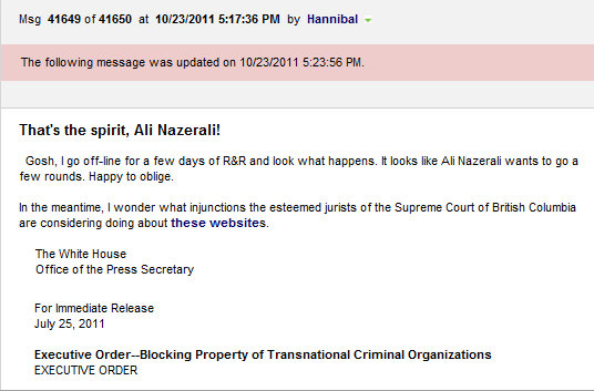 To: Jeffrey S. Mitchell who wrote (11530 ) 10/24/2011 11:15:59 AM From: Jeffrey S. Mitchell Read Replies (2) | Respond to of 12465 Re: 10/23/11 - [OSTK] GaryWeiss.com: Patrick Byrne to Libel Plaintiff: Drop Dead Patrick Byrne to Libel Plaintiff: Drop Dead Byrne at work making life easy for Nazerali's lawyers After three days of silence about the libel suit that has shuttered his Deep Capture stock market conspracy website , Overstock.com CEO Patrick Byrne surfaced today on the Investor Village message boards. He had a message for the gentleman suing him, which can be summed up thusly: Drop dead. In a post entitled, "That's the spirit, Ali Nazerali!" . Byrne said: "Gosh, I go off-line for a few days of R&R and look what happens. It looks like Ali Nazerali wants to go a few rounds. Happy to oblige." Since Byrne is likely to be paying for the privilege, I'm sure that Nazerali will be happy to oblige as well. What's interesting about his post is that he includes a news article describing Nazerali as a "controversial Vancouver penny stock promoter" and, somewhat incongruously, the text of an executive order blocking property of transnational criminal organizations. The problem with this post is that it pretty strongly implies that Nazerali is a member of a transnational criminal organization and/or that he is involved in transnational criminal operations. Now, that's fine and dandy if you're making stuff up about, say, me -- as his toadies Judd Bagley and Mark Mitchell have done. I can't afford to sue him, and as a journalist I'd have considerable qualms about doing so. But here you have a man who clearly can, and is in the process of doing so, and is not only doing so but has succeeded in at least temporarily shutting his website. Yes, Nazerali is a controversial penny stock promoter. But that does not give Byrne the right to claim that he is a member of a transational criminal organization, or to contend, as he did in Deep Capture, that he is affiliated with Al Qaeda and the Mafia. It's fine to make that claim over a few beers at a bar in Provo, but when you do so on the web, it is going to cost you -- when you are sued in Canada. As best as I can tell, Mitchell recycled old coverage that Nazerali received some years ago, juicing it with stuff he made up. The aim, as best I can tell, was to create an entire imaginary universe of stock promoters who didn't promote shocks but actually naked-shorted them. (That is, of course, the crime of the century.) And, if Byrne's recklessness is printing that rubbish wasn't already evident, Byrne has just done an excellent job of showing the kind of malice for which punitive damages are granted. Yes, we all know: Byrne is "nucking futs." He is about to learn, in a very protracted fashion, that insanity is no defense to a libel suit. In a comment to yesterday's item that wound up in the junk filter, Byrne's deputy at Overstock, Bagley, said that the "Streisand Effect" will ultimately make this all worthwhile for him and Byrne. (I.e., suing gives publicity to the libelous statements.) If I were Byrne, I would be more concerned about the "Henry Ford-Westbrook Pegler Effect." Successful libel suits ruined the reputation of Jew-baiting industrialist Henry Ford and destroyed the career (and finances) of red-baiting columnist Westbrook Pegler. Byrne is an ant by comparison. Ali Nazerali may not be a choir boy, but Byrne had better be prepared to either prove that he is everything he says about him -- or be crushed. Canada is a nightmare for news organizations that have produced honest, truthful news articles that displease people. I can only imagine the kind of hell it is going to be for a corporate p.r. operation that makes stuff up. And make no mistake about it: the corporation involved is Overstock.com, a publicly traded company whose shareholders are as yet unaware of the mess they've just been pulled into. © 2011 Gary Weiss. All rights reserved. garyweiss.blogspot.com