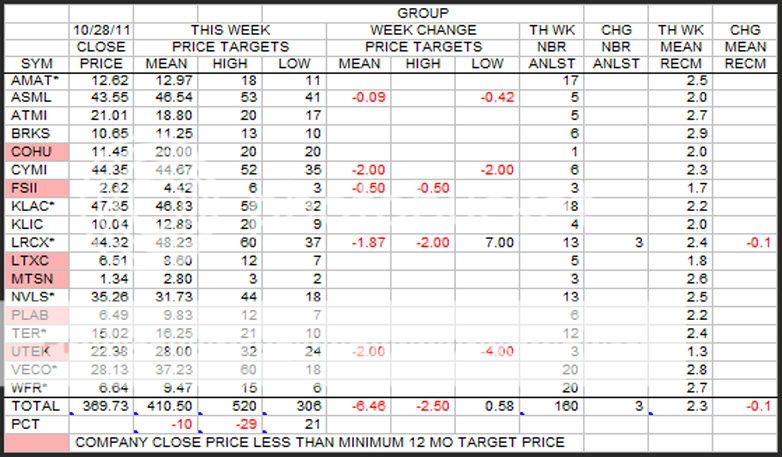 Even with all the price increases this week, 6 of the stocks still closed with prices lower than the low analyst 12 month target price. Also, mean target price continued to drift downward at the bottom line.