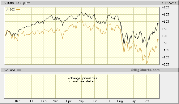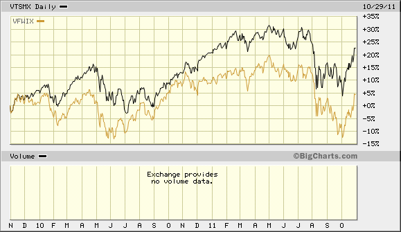 Bob Brinker has recommended Vanguard International Growth Fund since January, 2000 (that's as far back as I can check). The fund is very volatile and has taken several round-trip roller coaster rides. The 52-week closing high was $21.17 (April 29, 2011), and the closing low was $15.24 (October 3, 2011). Looks like the U.S. market outperformed by a mile this year, and the numbers look even worse longer term: