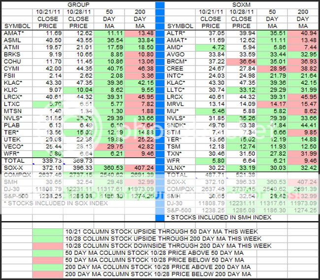 Two stocks in the Group and 2 more in the SOXM have risen above their 50 day MA. Three stocks in the Group and 3 more in the SOXM have risen above their 200 day MA. BRCM lost ground this past week and drifted below its 200 day MA. In the 50 day and 200 day MA columns show green for those stocks above the average and red for those below the average.