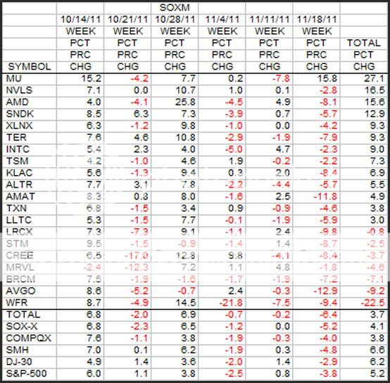 This is a longer 6 week look at the SOXM stocks in terms of percent change.