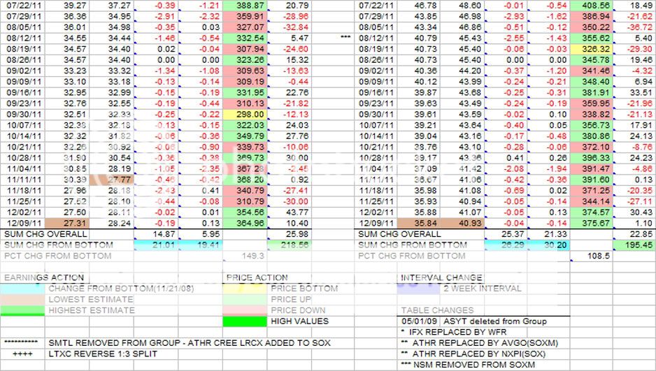 This is the weekly update of the Group and SOXM(SOX) tables in terms of earnings estimates and price changes.