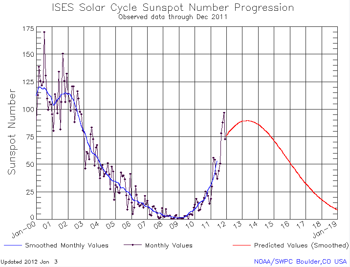 Figure 1: Smoothed monthly sunspot number over the second half of solar cycle 23 and beginning of cycle 24 (blue) and the predicted values over the rest of cycle 24 (red) ( NOAA).