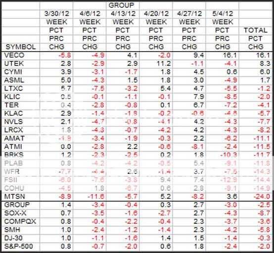 The Group did much better than the SOX over this period, down only 2.5 compared to 8.7 percent. Eight of the 18 stocks are down over 10 percent. MTSN in particular has been hit hard, down 24 percent.