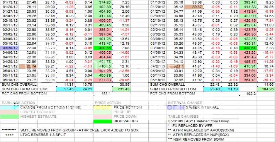 This is the weekly update to the Group and SOXM(SOX) tables in terms of earnings estimates and price changes.
