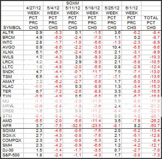 Here there are no "saviors" like VECO and CYMI for the Group. All the stocks are are deeply in the red, some a lot more than others. In 6 weeks, WFR is down 50.7 percent even with an 8.2 percent gain for the week.