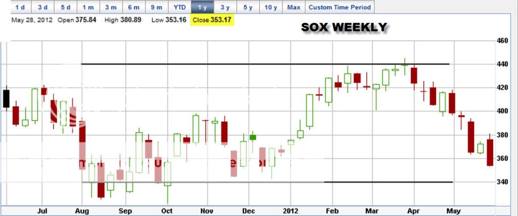 To: Return to Sender who wrote (56483 ) 6/3/2012 4:02:16 PM From: Donald Wennerstrom 2 Recommendations Read Replies (2) | Respond to of 95400 As always, I get a lot out of reading the IH weekly report. It covers a lot of ground and has a lot of statistical information to go along with it. One of the areas covered is the SOX, and this is what IH had to say: <<SOX. The semiconductors were crushed. Down over 4%, gapping below the recent lows and selling off. Already down below the 200 day EMA, so that is not in play. The next support levels in play are a long way down near 345. It has another 8-10 points to the downside . Semiconductors do not look good. They were leading lower and, true to form, they are leading the market to the downside as the rest of the market decides to follow these commodities to the downside that are in everything we buy now .>> Speaking of the downside, let's look at the weekly SOX action for the past year. As a point of information from where I am coming from, IMO the "guru financial press" started touting the "recovery" "big time" starting about last October. This effort IMO has continued without letup until the present. Here is a sample from Briefing.com's Page 1 of 30 March: <<Last Update: 30-Mar-12 08:51 ET The Rally is Fully Justified Stock futures indicate an up open of about 6 points for the S&P 500. That would put the index on track for a 12% gain for the first quarter of this year. There is a lot of head scratching and anxiety over the surprising rally of the past few months. Many analysts look to explain the improvement in equity values in terms of the Fed enhancing liquidity, or simply the reduction in "tail end risk" associated with a lower probability of a credit crisis in Europe. In fact, our January 3 Big Picture article titled "The Bullish Alternative" laid out the rationale for a 20% gain in the S&P 500 this year based on fundamentals. The S&P 500 index started 2011 at low valuations. S&P profits were up 14% in 2011, yet the index was flat. If profits rise 6% this year (general expectations) the S&P could rise 20% in 2012 just to keep up with the profit gains over 2011-2012 and still maintain low valuations. The gains in the S&P 500 this year simply reflect the index gaining ground consistent with profit gains last year. There was some serious catching up to do. The reduction of risk from Europe has allowed it to happen quickly. A correction is always possible after a strong run such as occurred recently, but market participants need not worry about a mini-bubble or irrational exuberance. The rally is justified based on the fundamentals. Today, there might be some end-of-quarter buying by portfolio managers getting fully on board with that theme. February personal income was up 0.2%, a tad below expectations of a 0.3% gain. Spending was up 0.8%, a solid gain that was a bit higher than expected. These data won't have much market impact. The key inflation index associated with these data, the core personal consumption expenditure deflator (PCE) was up just 0.1%. That is a Fed favorite for measuring inflation and doesn't reflect price pressures at a level of any concern. There are reports that European finance ministers will soon announce enhanced measures to address the sovereign credit crisis. That is providing support to the stock market today. The Chicago Purchasing Managers index is due at 9:45 ET and the finalized Michigan sentiment index is due at 9:55 ET. The market has shown tremendous intra-day resilience this past week even after significant down opens. The pattern of bouncing mid-day has been a boon to day traders, and reflects underlying support for equities. There has not been extended selling even on bad news. Upcoming earnings reports may present some headwinds for the market, and the upward momentum has stalled, but the market action has been surprisingly good. The fundamentals remains bullish . Dick Green Founder and Chairman, Briefing.com >> briefing.com Now let's look at the SOX chart. Starting in October, the SOX gained essentially 60 points in 4 weeks, or an average of 15 points a week. A really great "breakout". Then a pullback period occurred for the next 7 weeks until the middle of December. The next 15 weeks was a great upward trend to the end of March when the SOX peaked out at 438.64 starting at 352.86. That is a gain of about 86 points, or 24 percent. However, since that point, the SOX has been in a steep downtrend for the last 9 weeks. Five of those weeks have been big, long, dark red candles. Where we stop the downtrend no one knows, but IMO we have further to go. IMO we will need some quite good news to turn this around without at least hitting 340. I have no prediction as to whether or not we going into a recession, but I do find the situation extremely interesting. ECRI made the recession call on 30 September. At that point, almost to the day in early October, the "stock market press" started touting the great recovery. As shown above, on 30 Mar, a prediction was made for "easily" making a 20 percent gain in the S&P-500 for 2012. Where are we as of last Friday's close? - the gain for the year is 1.6 percent. The DOW is negative 0.8 percent for the year and the SOX is negative 3.1 percent. Personally, I find it very hard to wait to find out how this "battle" between ECRI and the pundits finally turns out. In the meantime we have to try to locate the coming "bottom" and catch the next uptrend early on.