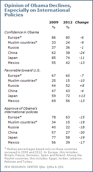 To: FJB who wrote (490819 ) 6/13/2012 10:26:35 AM From: goldworldnet 2 Recommendations Respond to of 793955 Global Opinion of Obama Slips, International Policies FaultedDrone Strikes Widely Opposed — Released: June 13, 2012pewglobal.org OVERVIEW Global approval of President Barack Obama’s policies has declined significantly since he first took office, while overall confidence in him and attitudes toward the U.S. have slipped modestly as a consequence. Europeans and Japanese remain largely confident in Obama, albeit somewhat less so than in 2009, while Muslim publics remain largely critical. A similar pattern characterizes overall ratings for the U.S. – in the EU and Japan, views are still positive, but the U.S. remains unpopular in nations such as Egypt, Jordan, Turkey and Pakistan. Meanwhile, support for Obama has waned significantly in China. Since 2009, confidence in the American president has declined by 24 percentage points and approval of his policies has fallen 30 points. Mexicans have also soured on his policies, and many fewer express confidence in him today. The Obama era has coincided with major changes in international perceptions of American power – especially U.S. economic power. The global financial crisis and the steady rise of China have led many to declare China the world’s economic leader, and this trend is especially strong among some of America’s major European allies. Today, solid majorities in Germany (62%), Britain (58%), France (57%) and Spain (57%) name China as the world’s top economic power. Even though many think American economic clout is in relative decline, publics around the world continue to worry about how the U.S. uses its power – in particular its military power – in international affairs. There remains a widespread perception that the U.S. acts unilaterally and does not consider the interests of other countries. In predominantly Muslim nations, American anti-terrorism efforts are still widely unpopular. And in nearly all countries, there is considerable opposition to a major component of the Obama administration’s anti-terrorism policy: drone strikes. In 17 of 20 countries, more than half disapprove of U.S. drone attacks targeting extremist leaders and groups in nations such as Pakistan, Yemen and Somalia. Americans are the clear outliers on this issue – 62% approve of the drone campaign, including most Republicans (74%), independents (60%) and Democrats (58%). These are among the principal findings from a 21-nation survey conducted by the Pew Research Center’s Global Attitudes Project from March 17-April 20. The poll also finds that, despite disappointment with Obama’s policies, there is still considerable support for his re-election in many countries, especially in Europe. Roughly nine-in-ten in France (92%) and Germany (89%) would like to see him re-elected, as would large majorities in Britain (73%), Spain (71%), Italy (69%) and the Czech Republic (67%). Most Brazilians (72%) and Japanese (66%) agree. But in the Middle East there is little enthusiasm for a second term – majorities in Egypt (76%), Jordan (73%) and Lebanon (62%) oppose Obama’s re-election. This is a 7 page report. I've only shown the beginning of page one. (Page 1) pewglobal.org (Page 2) pewglobal.org (Page 3) pewglobal.org (Page 4) pewglobal.org (Page 5) pewglobal.org (Page 6) pewglobal.org (Page 7) pewglobal.org * * *